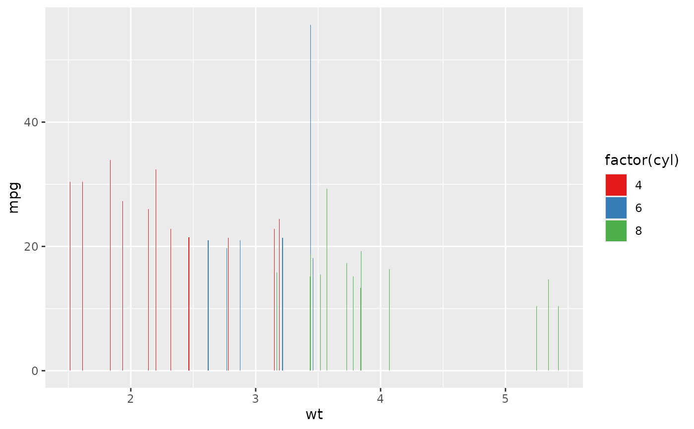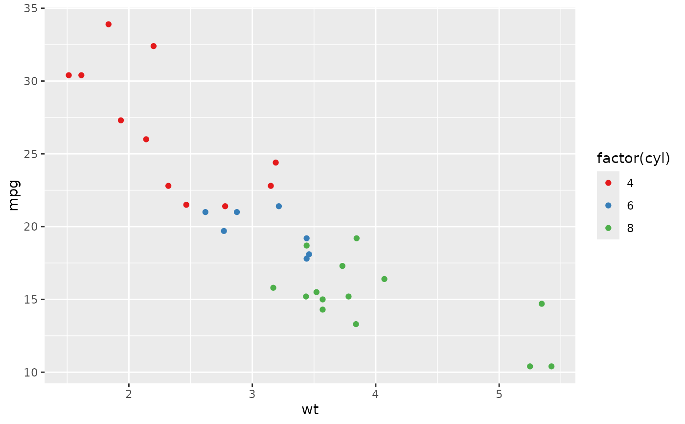 ggplot(mtcars, aes(x = wt, y = mpg, color = factor(cyl))) +