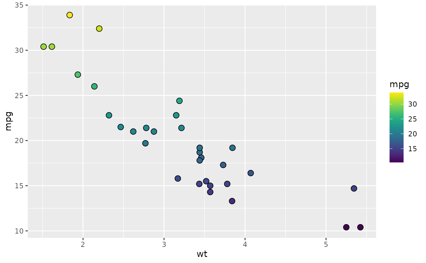 ggplot(mtcars, aes(x = wt, y = mpg, fill = mpg)) +